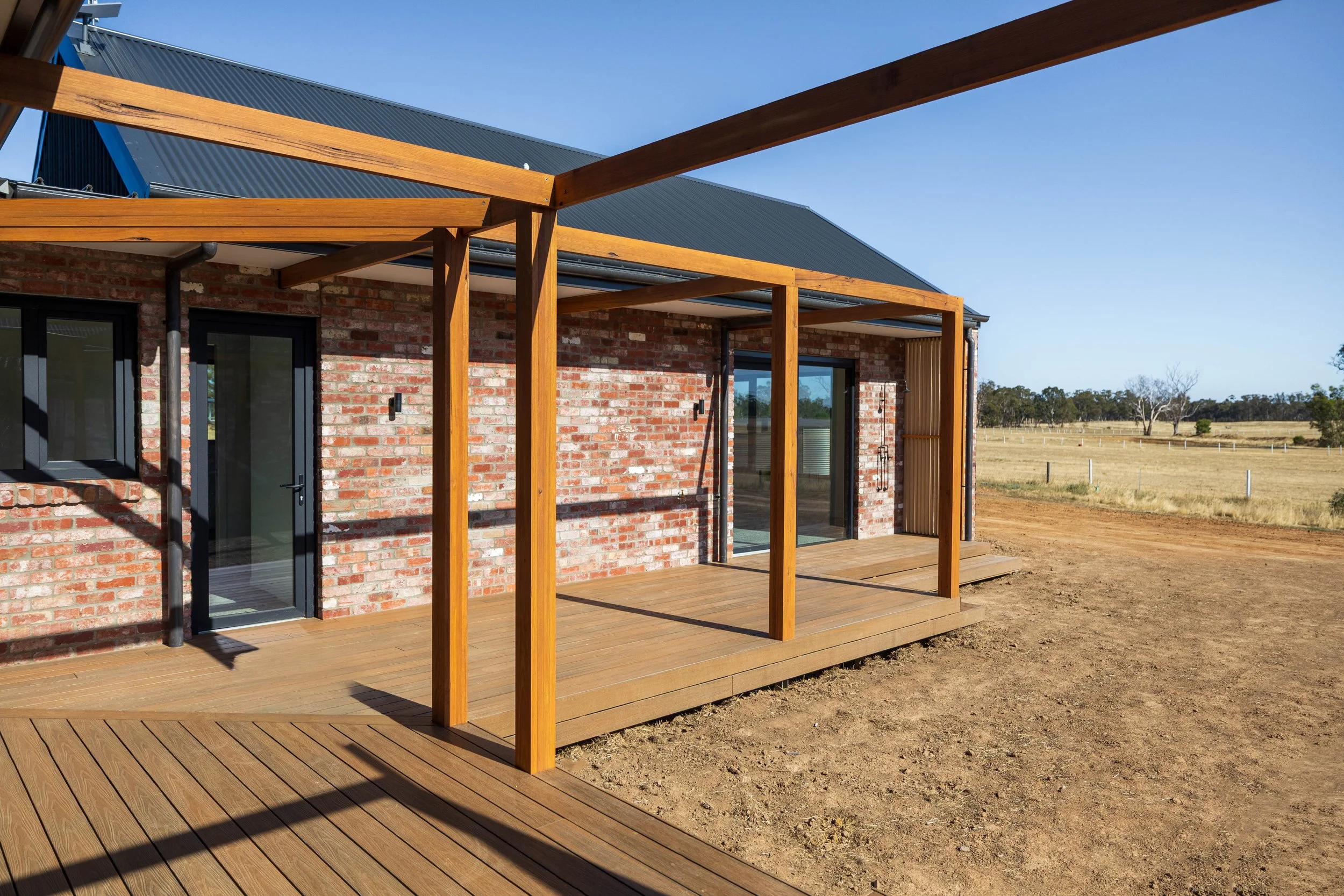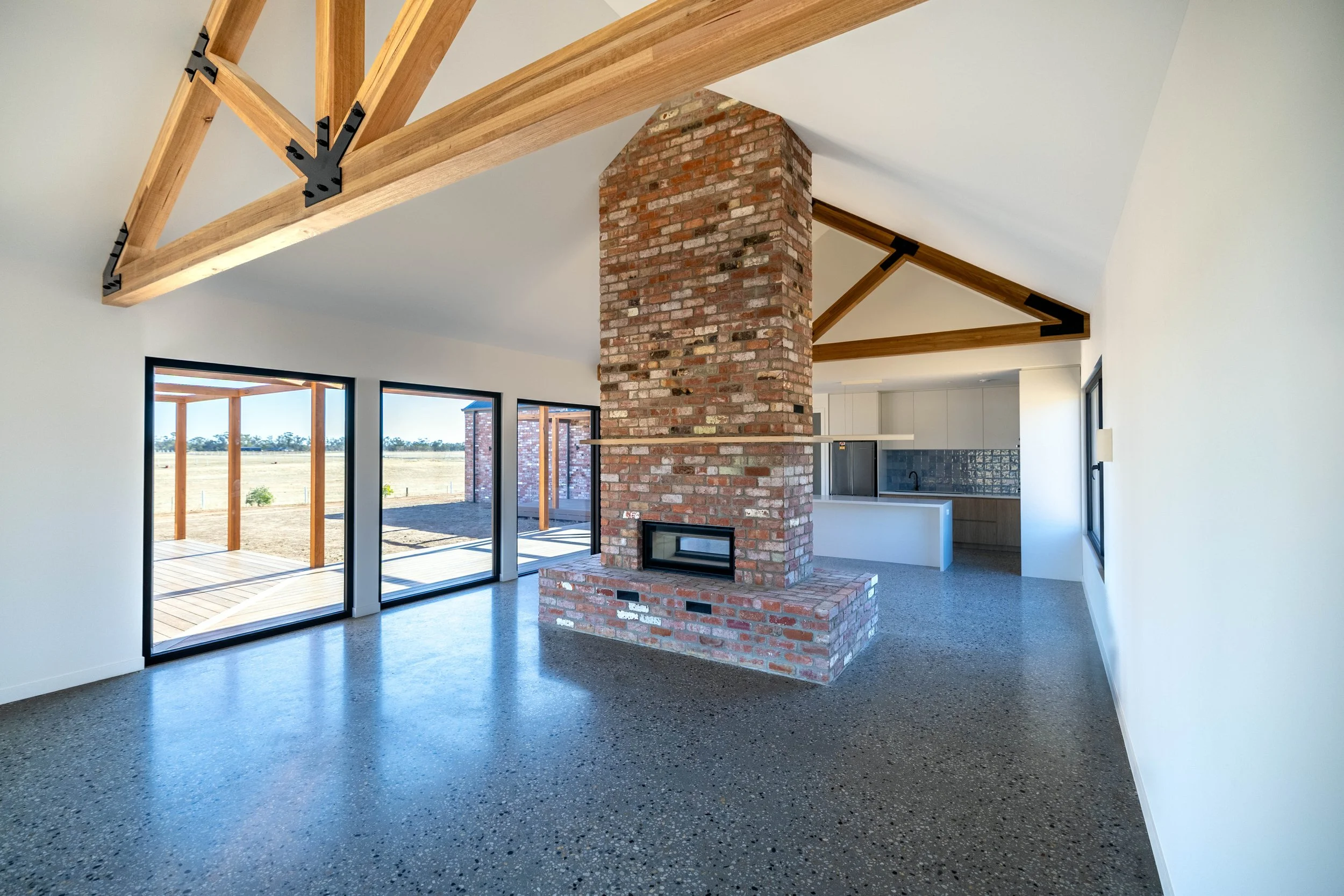 The exterior is a striking blend of recycled brick, longline cladding and timber screens, delivering both texture and warmth. A double sided brick fireplace anchors the living spaces creating a welcoming focal point for all seasons, while Techwood decking extends the home outdoors for effortless rural living.